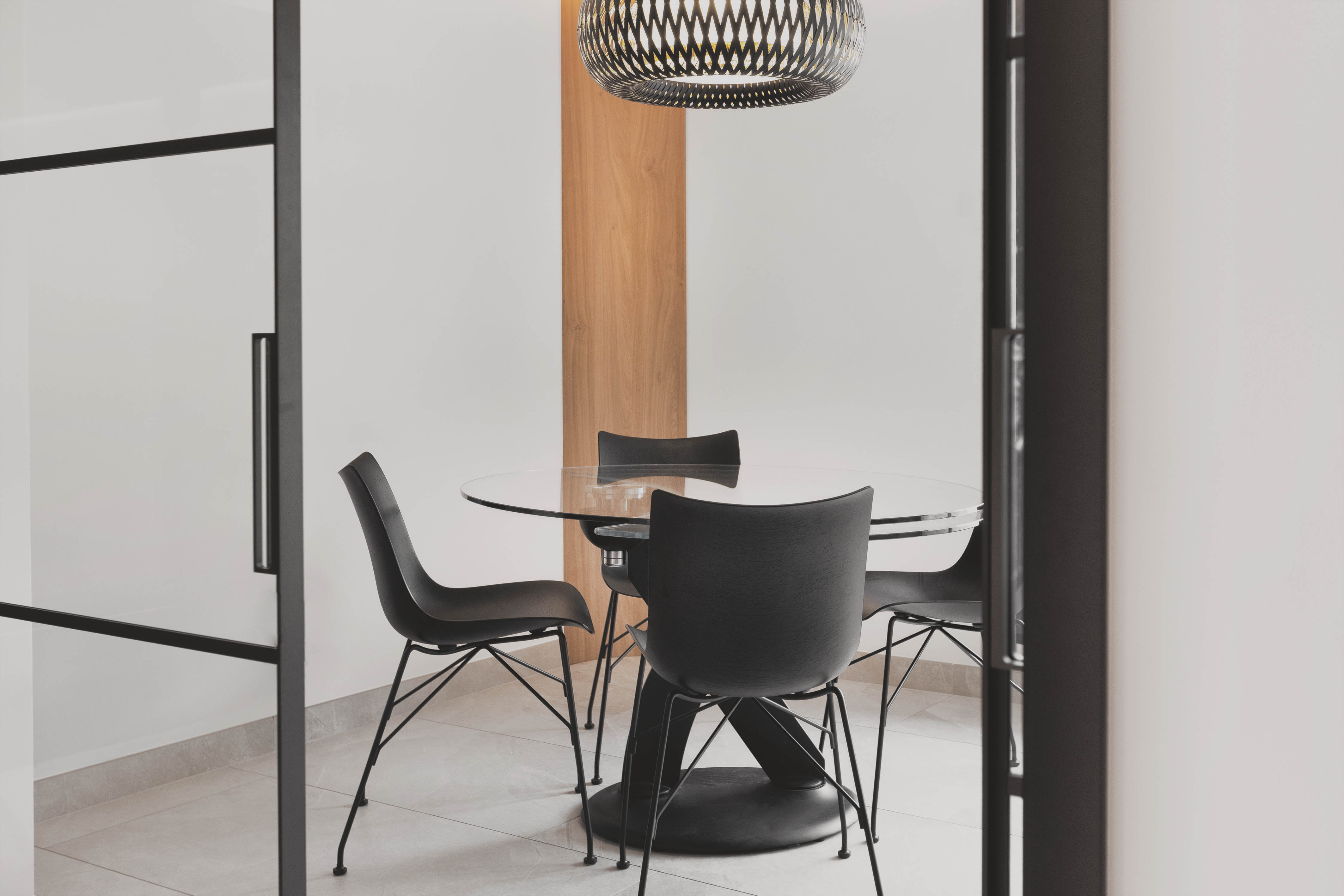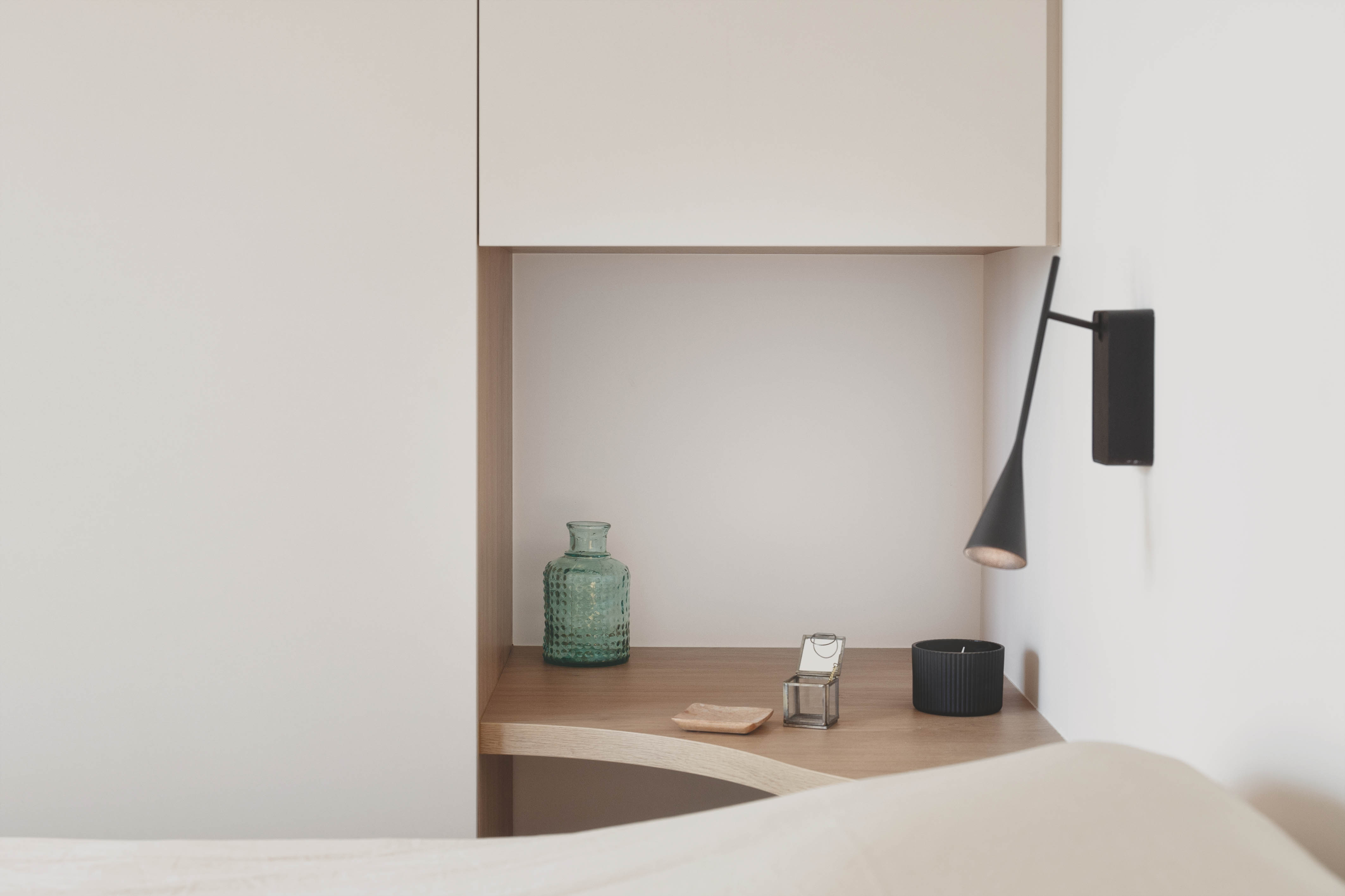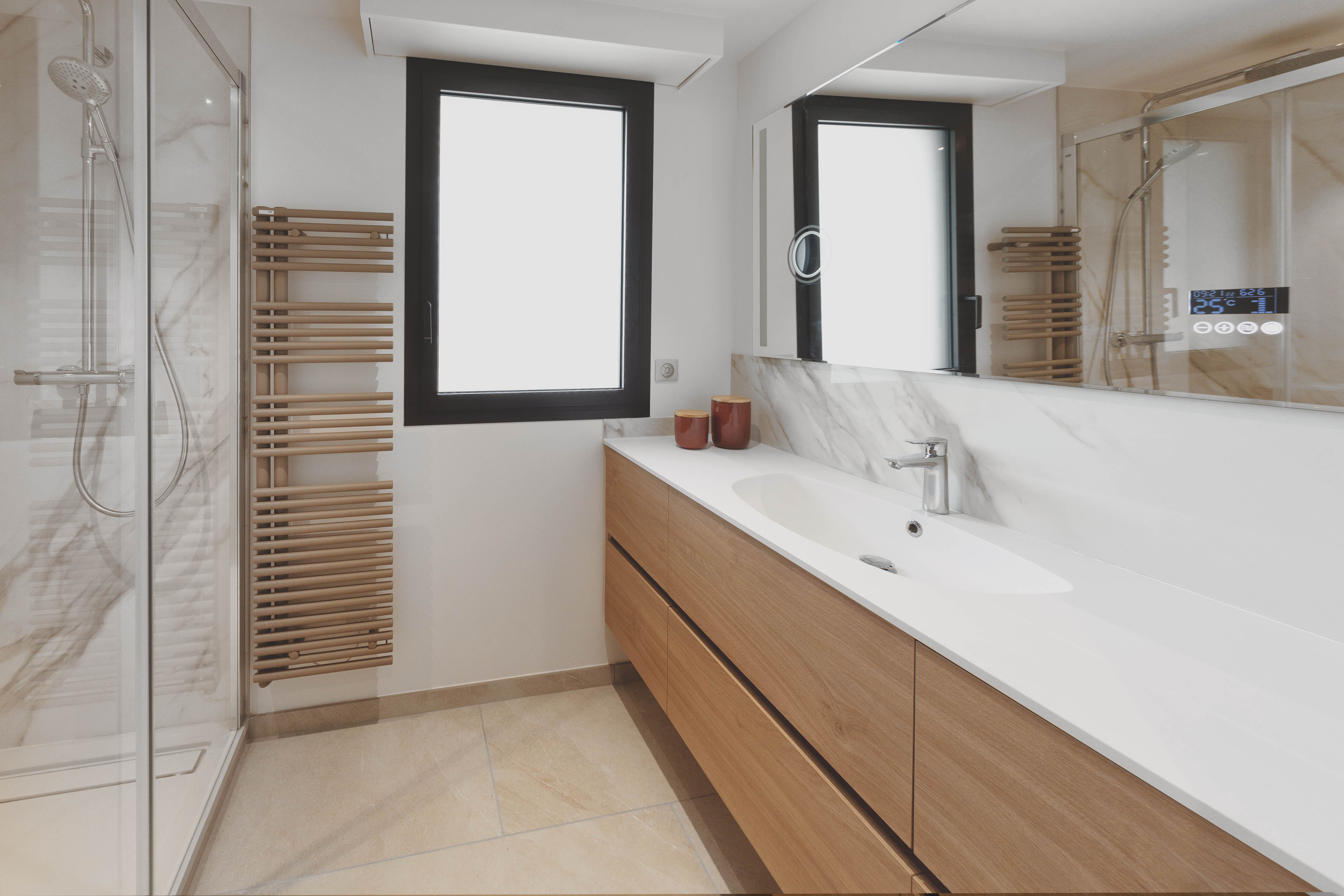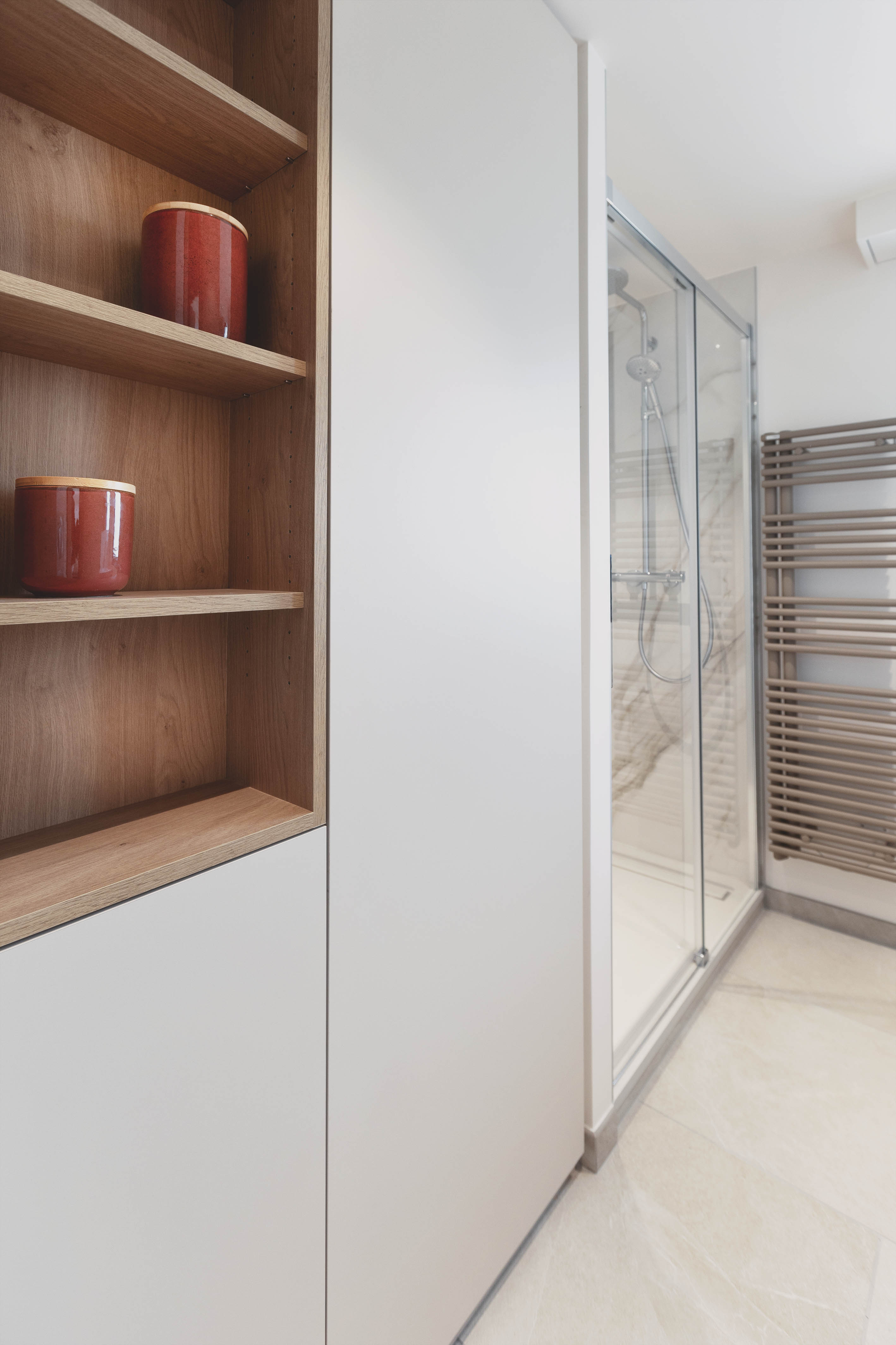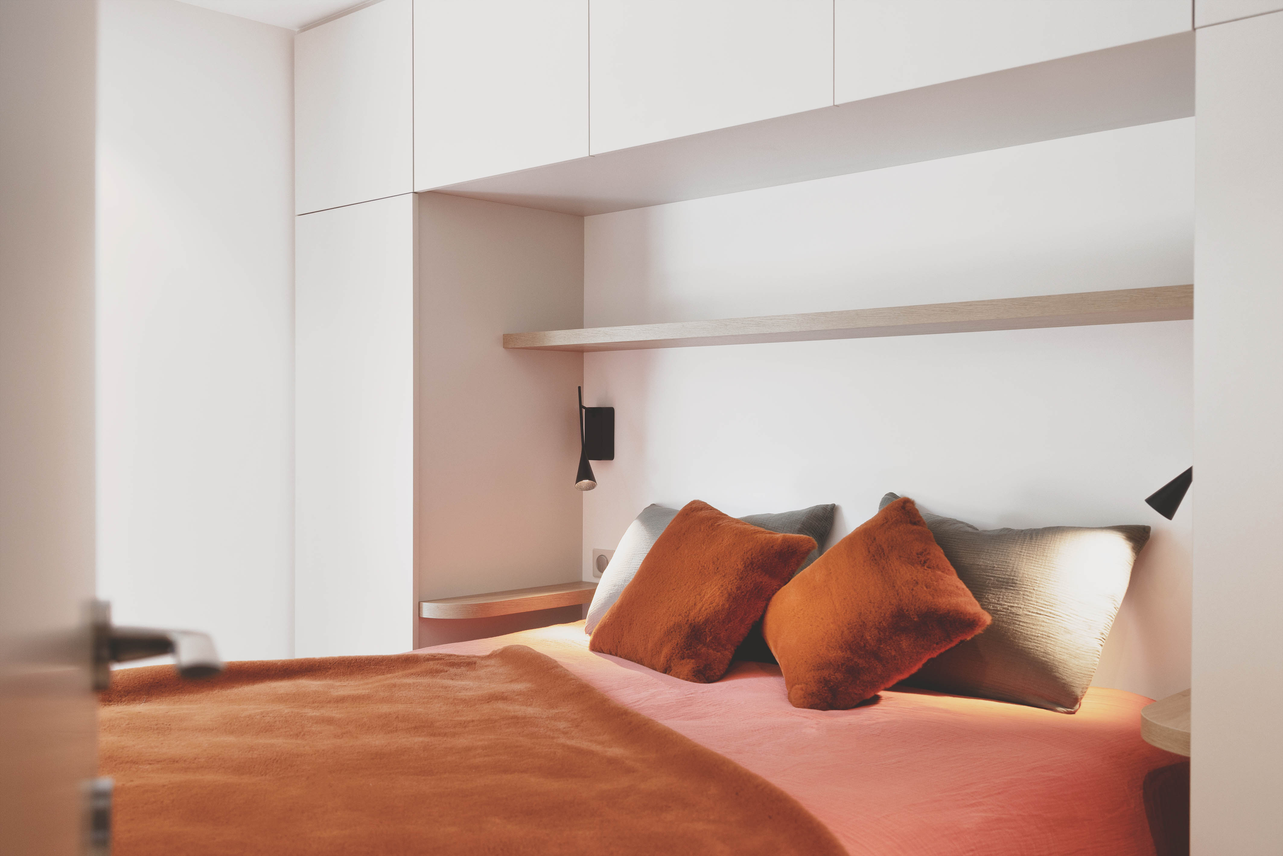 Accroché au pied de la montagne avec une vue imprenable sur le lac d’Annecy, cet appartement de 100m² était étouffé par des couches de revêtements du sol au plafond rendant les espaces exigus et l’atmosphère austère. L’enjeu était de redonner tout son potentiel au lieu et de le rendre à la fois pratique et modulable. Les clients souhaitaient une décoration épurée et intemporelle, nous avons donc choisi deux teintes chaleureuses pour les peintures, un carrelage extra fin grand format pour l’ensemble du sol, des touches de marbre et de bois pour rehausser le tout. Au final chaque pièce a trouvé sa place, l’entrée et le dégagement ne font qu’un volume uni et coloré dans lesquels les nombreuses portes au détail de cadres affleurant se fondent. Les agencements sur mesure omniprésents permettent de personnaliser les espaces et d’optimiser les rangements. Les transitions ont été pensées pour accompagner depuis l’entrée jusqu’à l’extérieur. Un claustra bois devient filtre entre la zone nuit et la zone jour puis un ouvrage en serrurerie qui sert à la fois d’escalier, de bibliothèque et de banquette encadre la baie principale qui s’ouvre sur le lac.